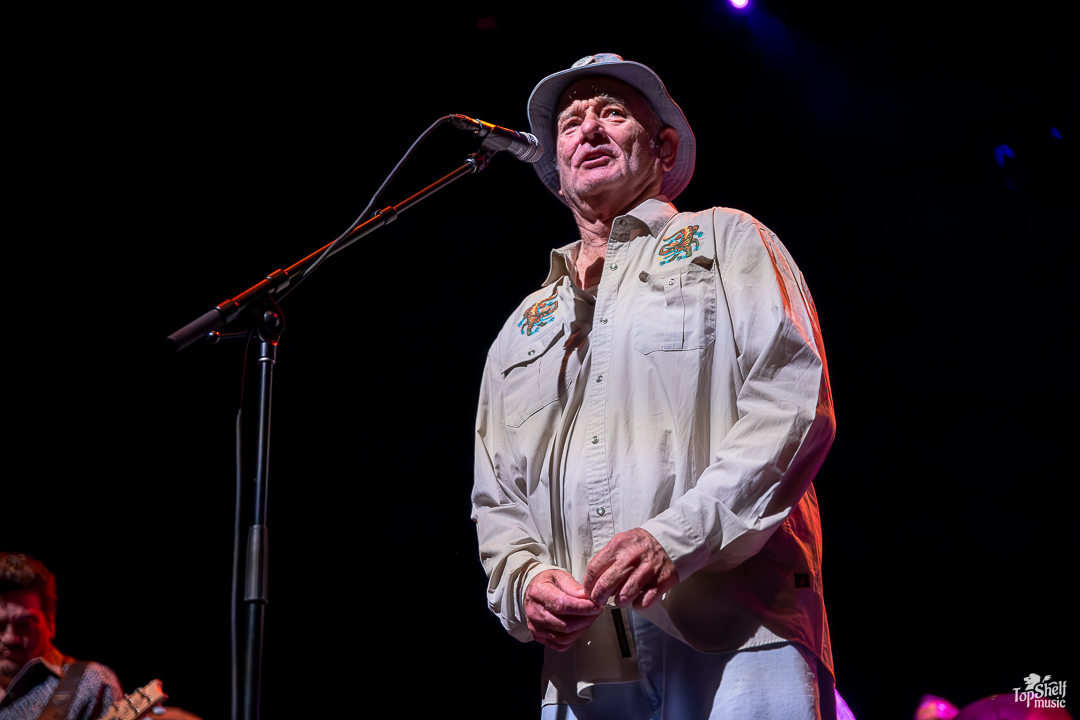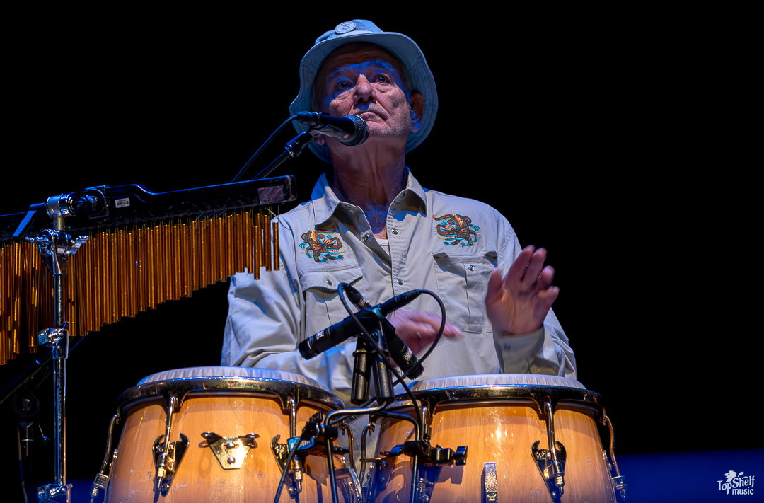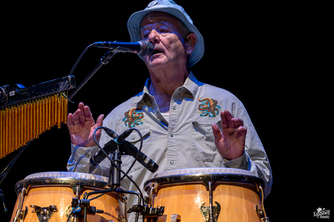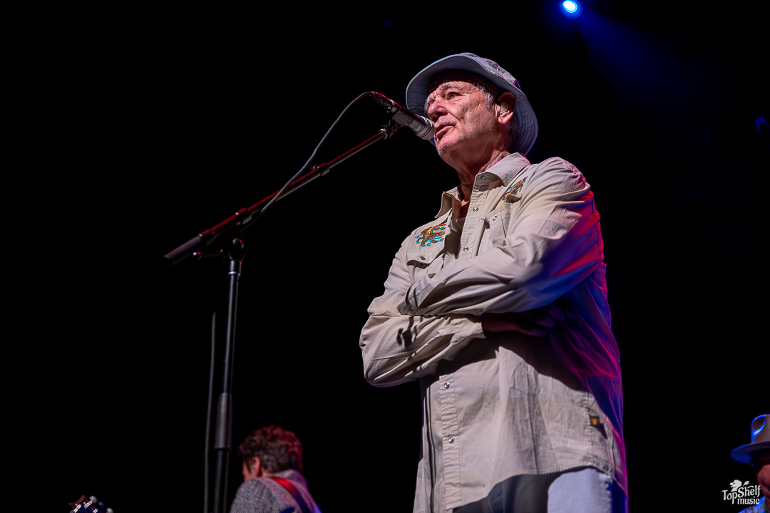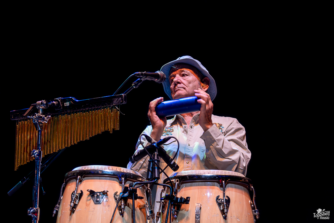 As I had no idea what to expect. The stage had two drum sets and congas for percussion, with several guitars and a piano. Was Bill Murray going to sing? Play? Both? The lights went down again and we all got our answer as the main man, wearing a Caddyshack-esque bucket hat (at least in my mind), took his place behind the congas at the back of the stage, letting his Blood Brothers steal the show for a bit. From dueling guitars to wicked solos, these players can WAIL; this is the kind of performance blues-lovers dream about. By song two, Bill Murray walked up to the mic to do his own rendition of “Waiting” by The Guess Who. He begged, he pleaded… he’s just so TIRED of waiting… the way Bill Murray keeps a stone-cold serious demeanor while going over-the-top in delivery is just comedic perfection. I couldn’t keep it together between laughing fits.