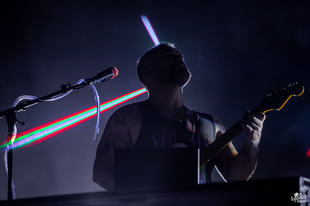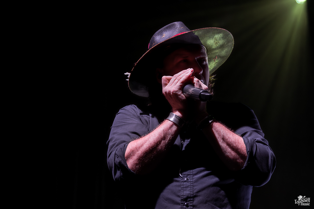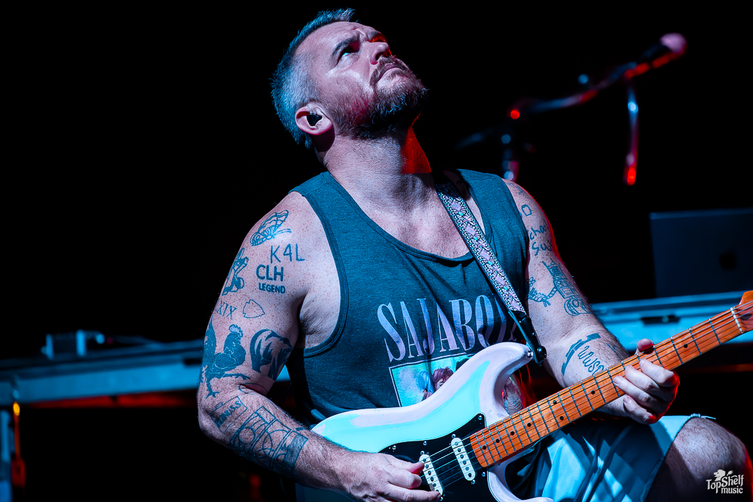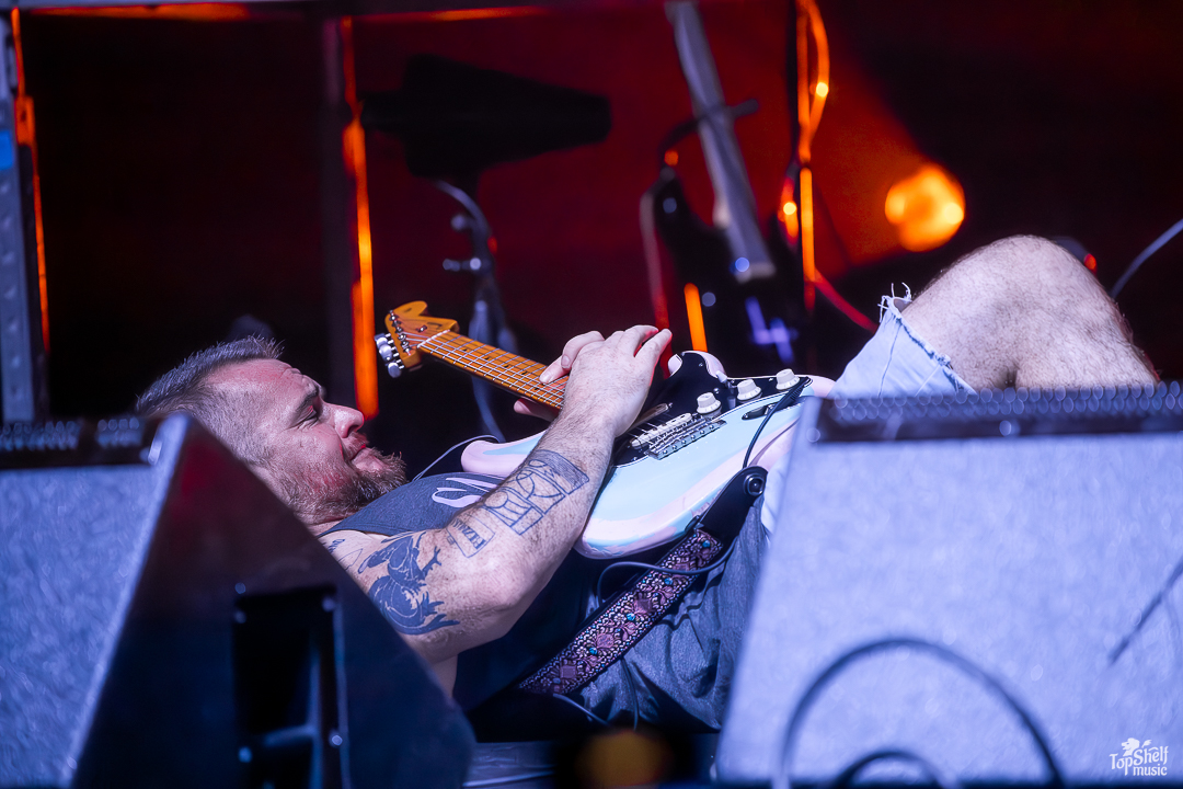 Of course, The Floozies‘ heavier sound, talk box vocals, and laser lights changed the vibe to a more head-banging atmosphere. Probably the best moment of the entire set was during song one… with nothing to do with the band, actually. While shooting in the pit, a man at the rail tapped my shoulder and asked if I can drape two shirts onstage that he made for the Floozie guys; it was Pizza hut’s logo reading “Penis Butt”. I draped the shirts at the top of the stage for vocalist/guitarist Matt Hill to see them whenever he came out from behind his key stand. Unfortunately, if Hill did see the shirts, he didn’t acknowledge. But, still, I did stuff.