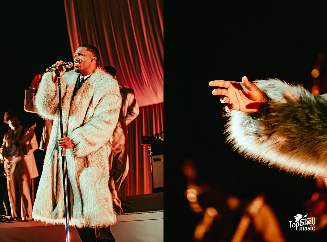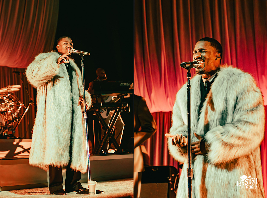 GIVĒON walked onto stage in a fur coat with a sleek black suit underneath.