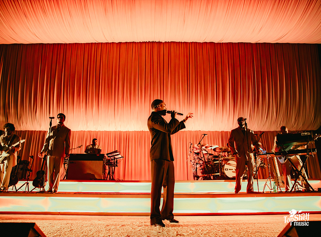 A singular spotlight illuminated his figure, as he stood in front of a plain white curtain. The orchestral intro to “MUD” rang through the venue, with the soulful singer transitioning into the lead single off his 2025 album BELOVED, “RATHER BE”. The curtain fell at this time, revealing his band sitting underneath beautiful, pleated drapery. Simple stage production emphasized GIVĒON’s smooth baritone vocals as he serenaded the crowd, covering songs across his discography including “The Beach” off his 2020 EP TAKE TIME, his verse off of Drake’s “Chicago Freestyle:, and “dec 11” off of 2022 album Give or Take.